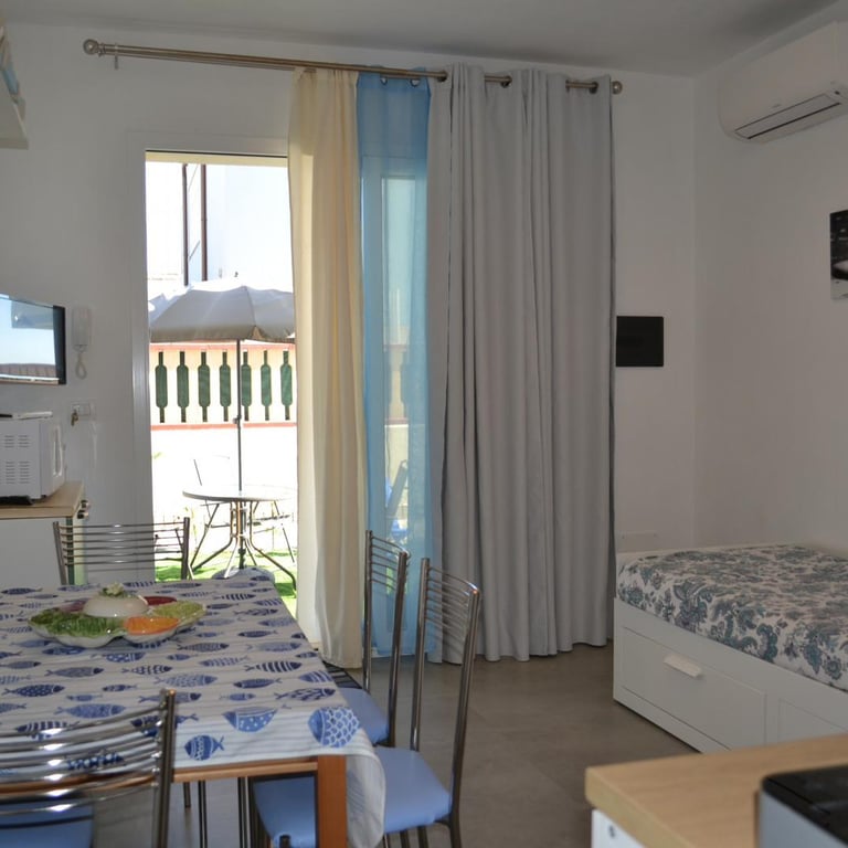 La camera matrimoniale offre riposo e luce naturale, il soggiorno con divano letto accoglie famiglie e coppie, la cucina attrezzata permette di preparare piatti locali con i profumi della Sicilia.